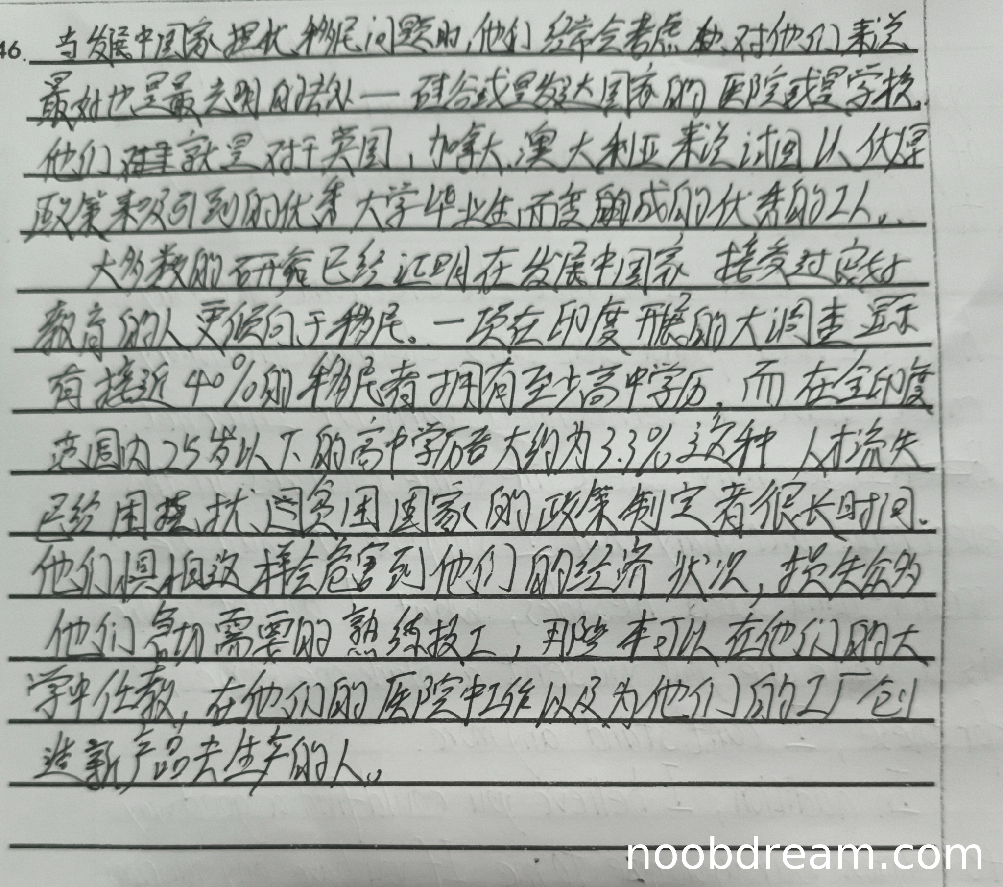 理由:第二段整体理解较好,准确传达了"brain drain"(人才流失)的核心概念。主要问题在于"25岁以下"应为"25岁以上"的识别错误,但根据禁止扣分原则,判断为识别错误不扣分。"损失会为他们急切需要的熟练技工"句式不够通顺,扣1分;"创造新产品去生产"表达不够精炼,扣1分。