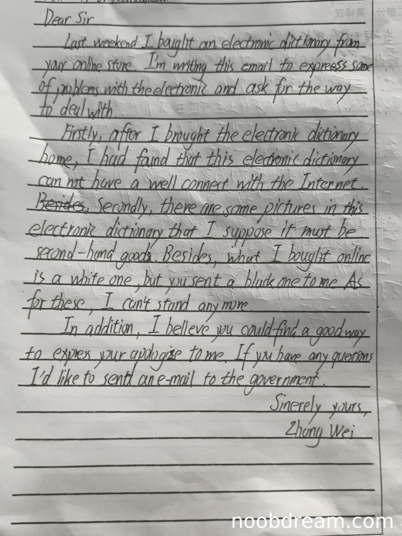 - 但署名错误,要求用"Zhang Wei"却写成"Zhong Wei"