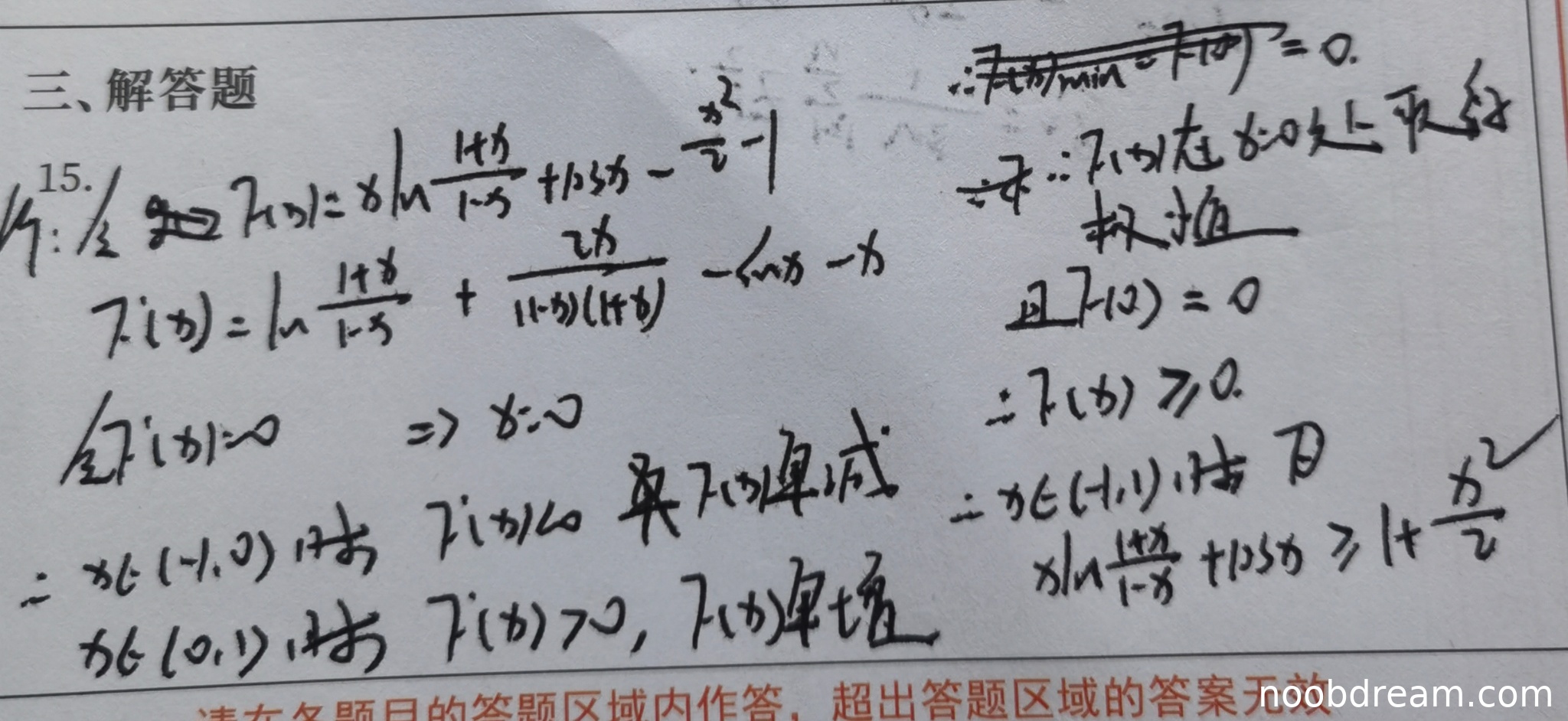 然而,学生在单调性分析中存在逻辑错误。标准答案中通过分 \(x>0\) 和 \(x<0\) 分别讨论 \(F'(x)\) 的符号,而学生直接断言 \(F'(x) < 0\) 对 \(x \in (-1,0)\) 和 \(F'(x) > 0\) 对 \(x \in (0,1)\),但未提供详细证明。实际上,\(F'(x)\) 的符号并非显然,例如在 \(x \in (-1,0)\) 时,\(\ln\frac{1+x}{1-x} < 0\),\(\frac{2x}{1-x^2} < 0\),且 \(-\sin x - x\) 的符号需进一步分析,学生未给出充分论证,因此存在逻辑不严谨之处。尽管最终结论正确,但证明过程不完整,扣2分。