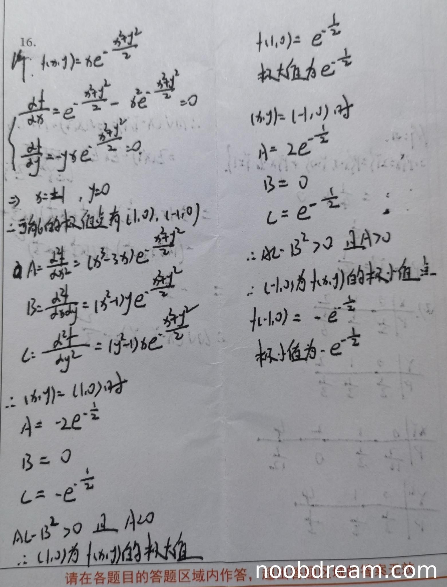 学生给出的二阶偏导数表达式有误:A的表达式应该是$(x^3-3x)e^{-\frac{x^2+y^2}{2}}$,但实际上是$(-2x+x^3)e^{-\frac{x^2+y^2}{2}}$。不过后续在具体点计算时,学生使用了正确的数值。考虑到这是计算过程中的笔误,且不影响后续判断,扣1分。得2分。