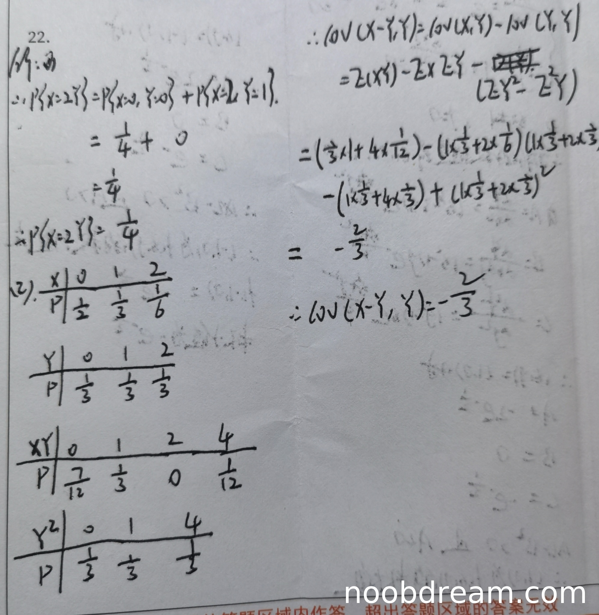 学生正确列出了 \(X\)、\(Y\)、\(XY\)、\(Y^2\) 的概率分布,并正确计算了 \(E(X)\)、\(E(Y)\)、\(E(XY)\)、\(E(Y^2)\)。在计算 \(\mathrm{Cov}(X-Y,Y)\) 时,学生使用了公式 \(\mathrm{Cov}(X-Y,Y) = \mathrm{Cov}(X,Y) - \mathrm{Cov}(Y,Y) = E(XY) - E(X)E(Y) - [E(Y^2) - E(Y)^2]\),这是正确的。代入数值后得到 \(-\frac{2}{3}\),与标准答案一致。因此,本小题得满分 7 分。