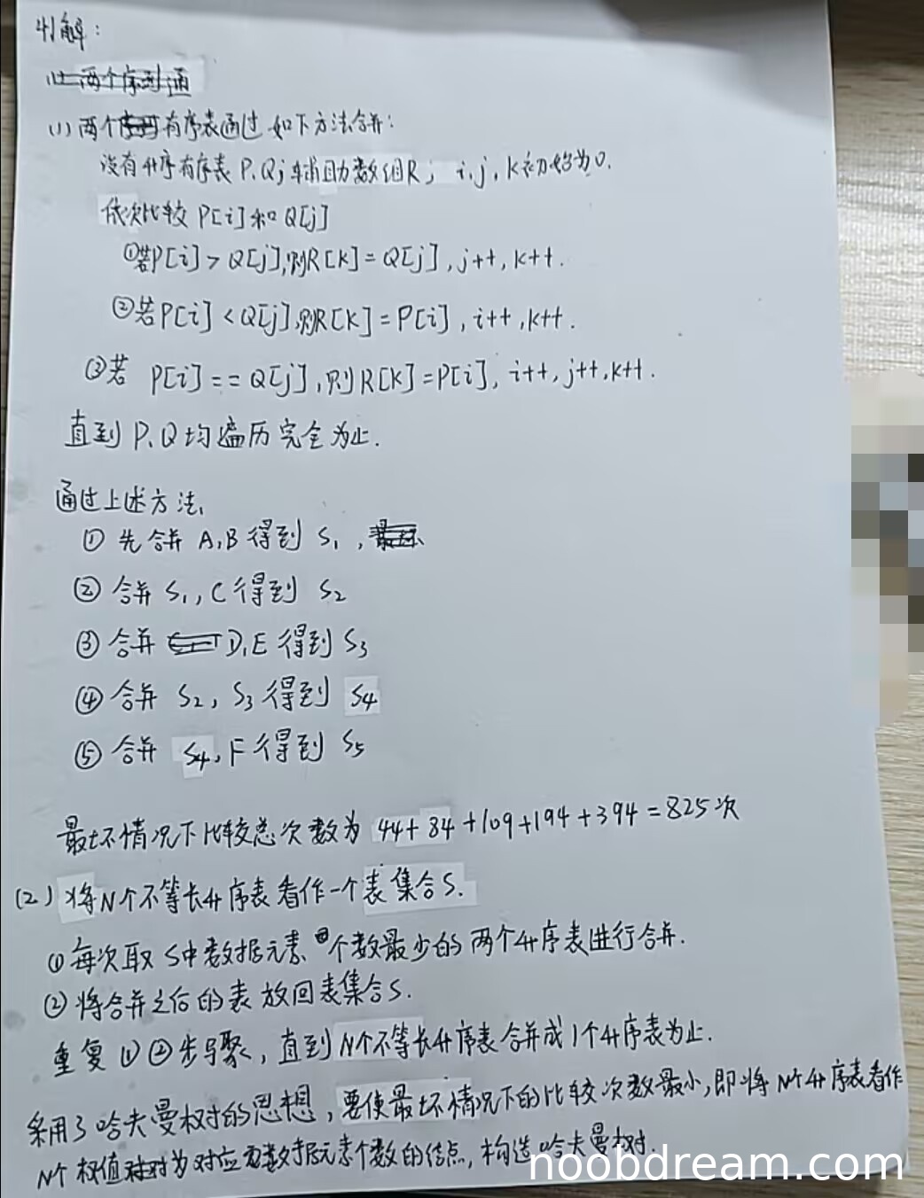 学生给出了合并过程:A与B合并为S₁,S₁与C合并为S₂,D与E合并为S₃,S₂与S₃合并为S₄,S₄与F合并为S₅。这一合并顺序与标准答案中的哈夫曼树(最佳归并树)思想一致,过程描述正确。同时,学生正确计算了每一步的最坏比较次数(44、84、109、194、394)和总次数825。根据评分标准,合并过程正确给5分,计算正确给2分,因此本小题得7分。
