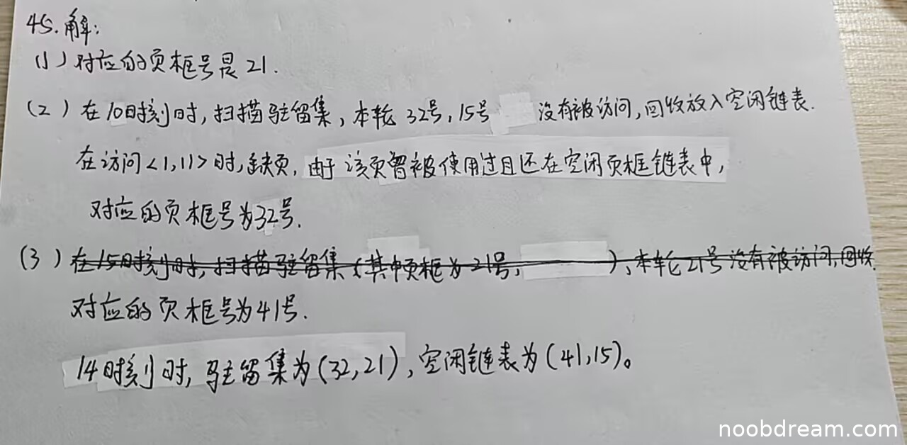 学生答案:在15时刻时,扫描驻留集(其中页框为21号, ),本轮21号没有被访问,回收。对应的页框号为41号。14时刻时,驻留集为(32,21),空闲链表为(41,15)。