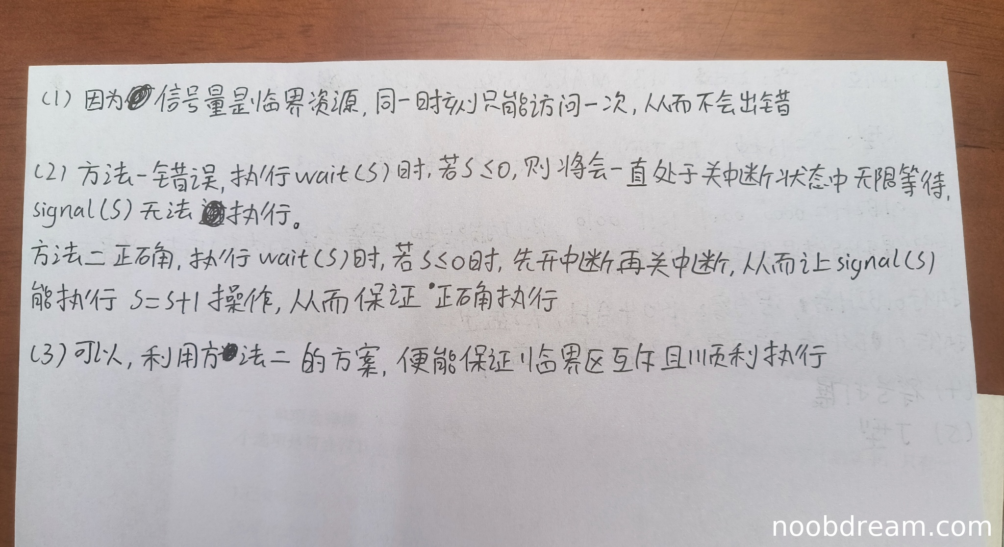 学生回答"因为信号量是临界资源,同一时刻只能访问一次,从而不会出错",正确指出了信号量是临界资源,需要互斥访问以防止出错。虽然表述不如标准答案详细(如未明确提到多个进程共享和读写操作),但核心意思正确。得2分。