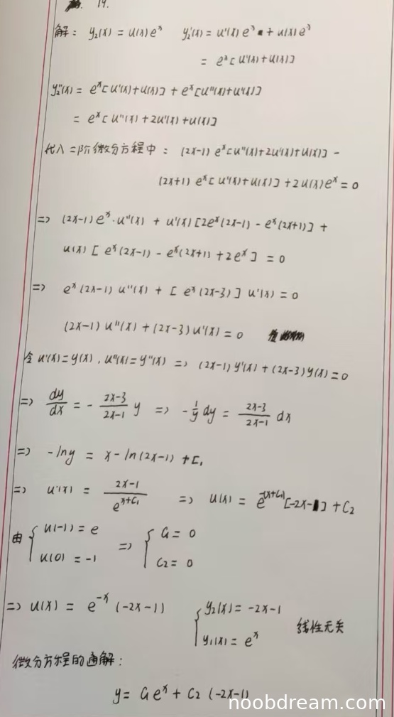 - 学生正确将 \(y_2(x) = \mu(x)e^x\) 代入微分方程,并推导出关于 \(\mu(x)\) 的微分方程 \((2x-1)\mu'' + (2x-3)\mu' = 0\),这一步与标准答案等价(标准答案为 \((2x-1)\mu'' = (3-2x)\mu'\),两者可通过移项相互转化),思路正确不扣分。