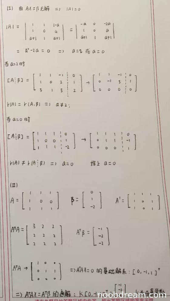 学生正确计算了A^TA和A^Tβ,并求出了齐次方程组的基础解系[0,-1,1]^T。但是只给出了齐次解k[0,-1,1]^T,没有求出特解,通解不完整。这是一个严重的逻辑错误,因为A^TAx=A^Tβ的通解应该是齐次解加特解。