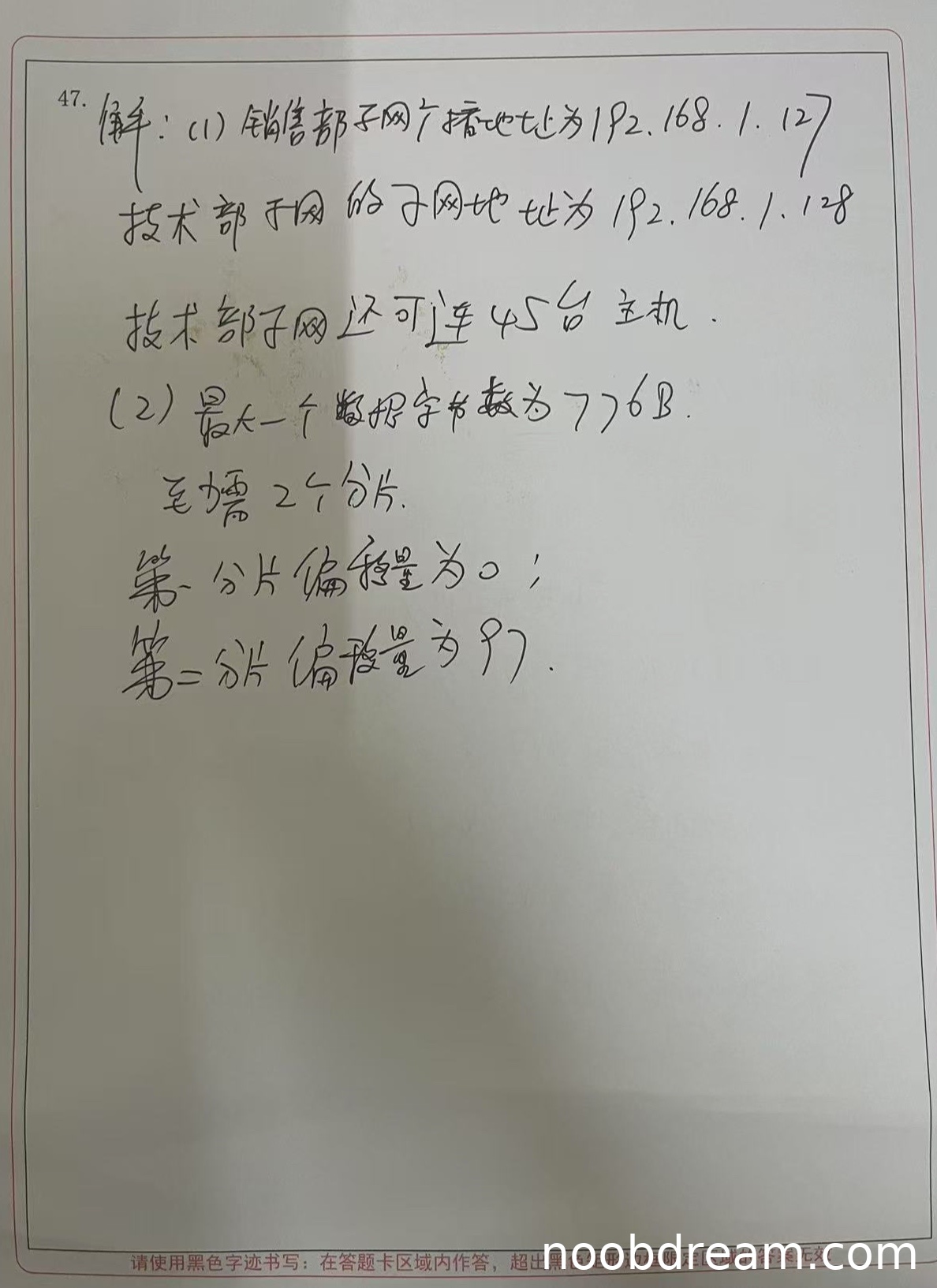 标准答案:销售部广播地址192.168.1.127,技术部子网地址192.168.1.128,还可连接45台主机。