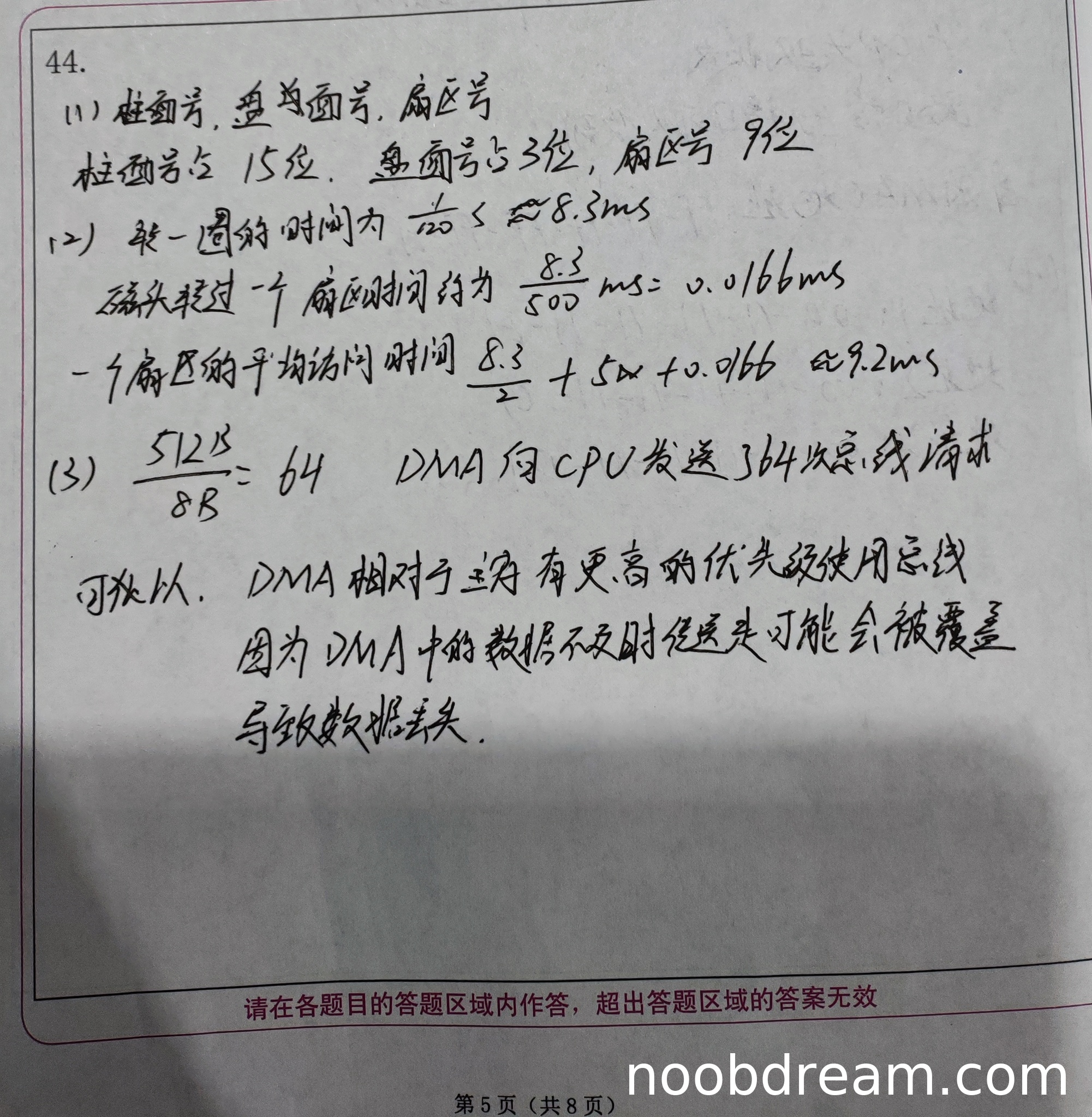 第一问计算512B/8B=64次正确(1分)。第二问回答"可以"并说明DMA优先级更高正确(1分)。第三问解释数据可能被覆盖导致丢失正确(1分)。本小题得3分。