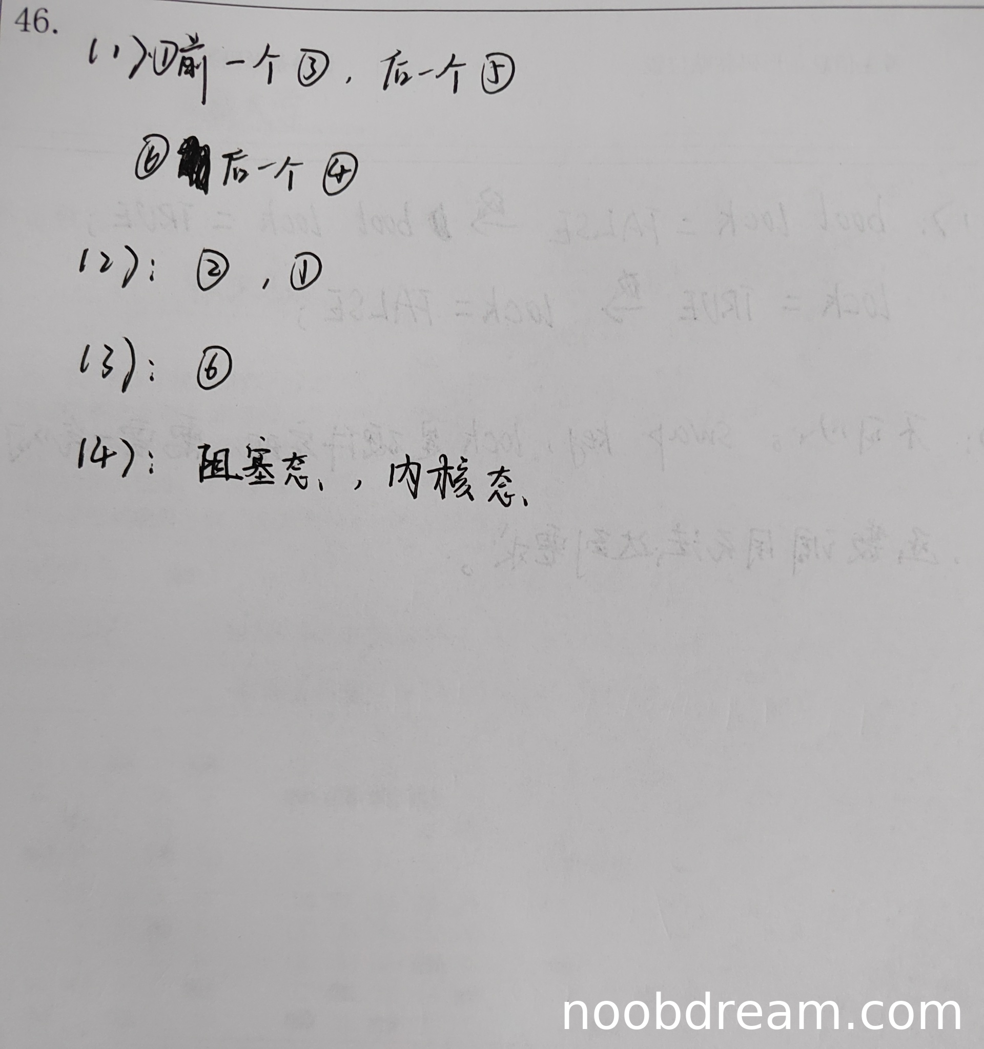 "阻塞态"即"阻塞状态",描述正确;键盘中断处理程序执行时CPU处于内核态,回答正确。得2分。