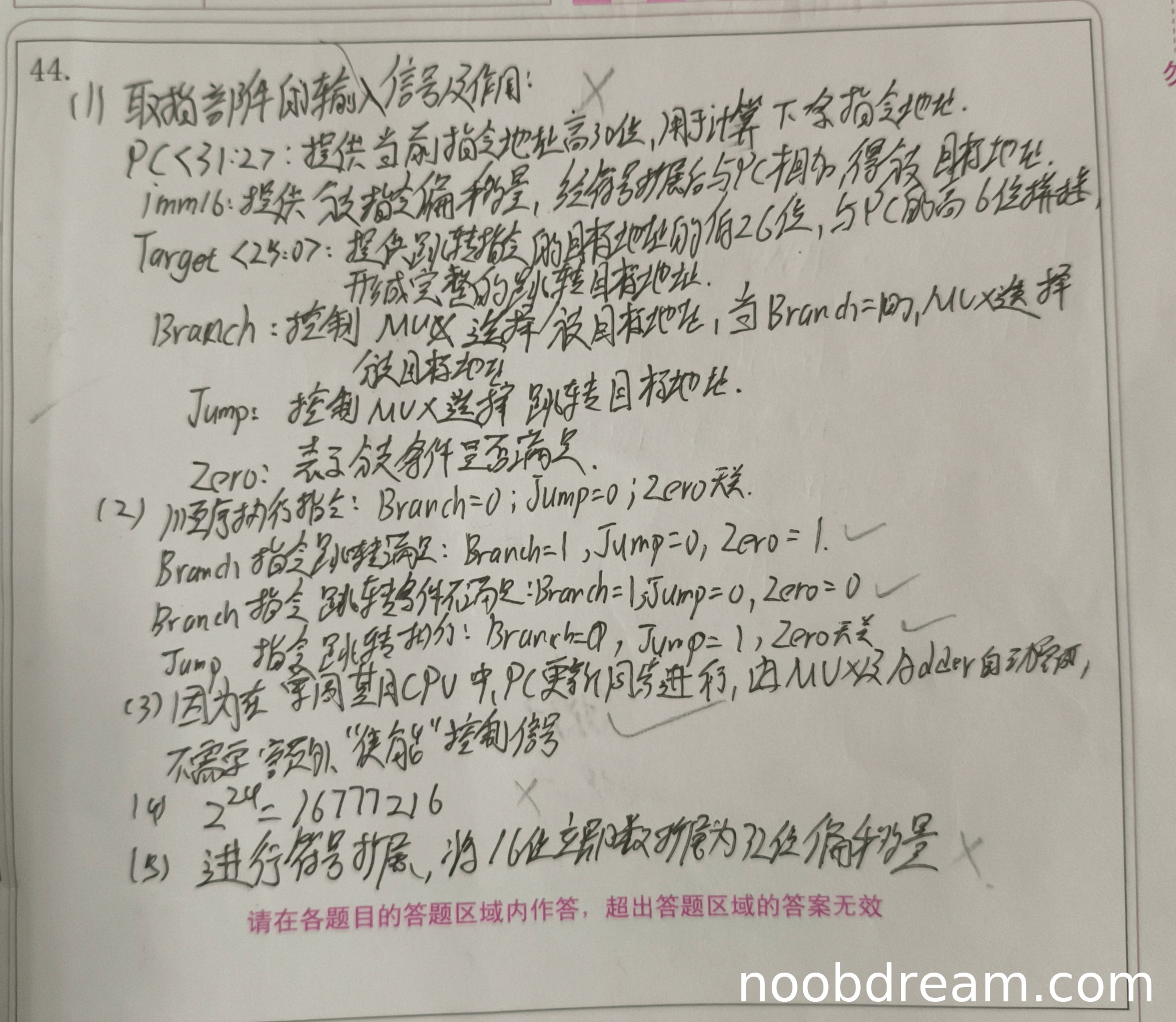 学生答案中列出了PC<31:27>、Imm16、Target<25:0>、Branch、Jump、Zero共6个输入信号,但标准答案只要求3个输入信号(Zero、Branch、Jump)。PC<31:27>、Imm16、Target<25:0>是数据通路中的内部信号或立即数,不是取指部件的输入控制信号。因此,学生多列了信号,但正确列出了Branch、Jump、Zero三个控制信号并说明了作用,部分正确。扣1分,得2分。