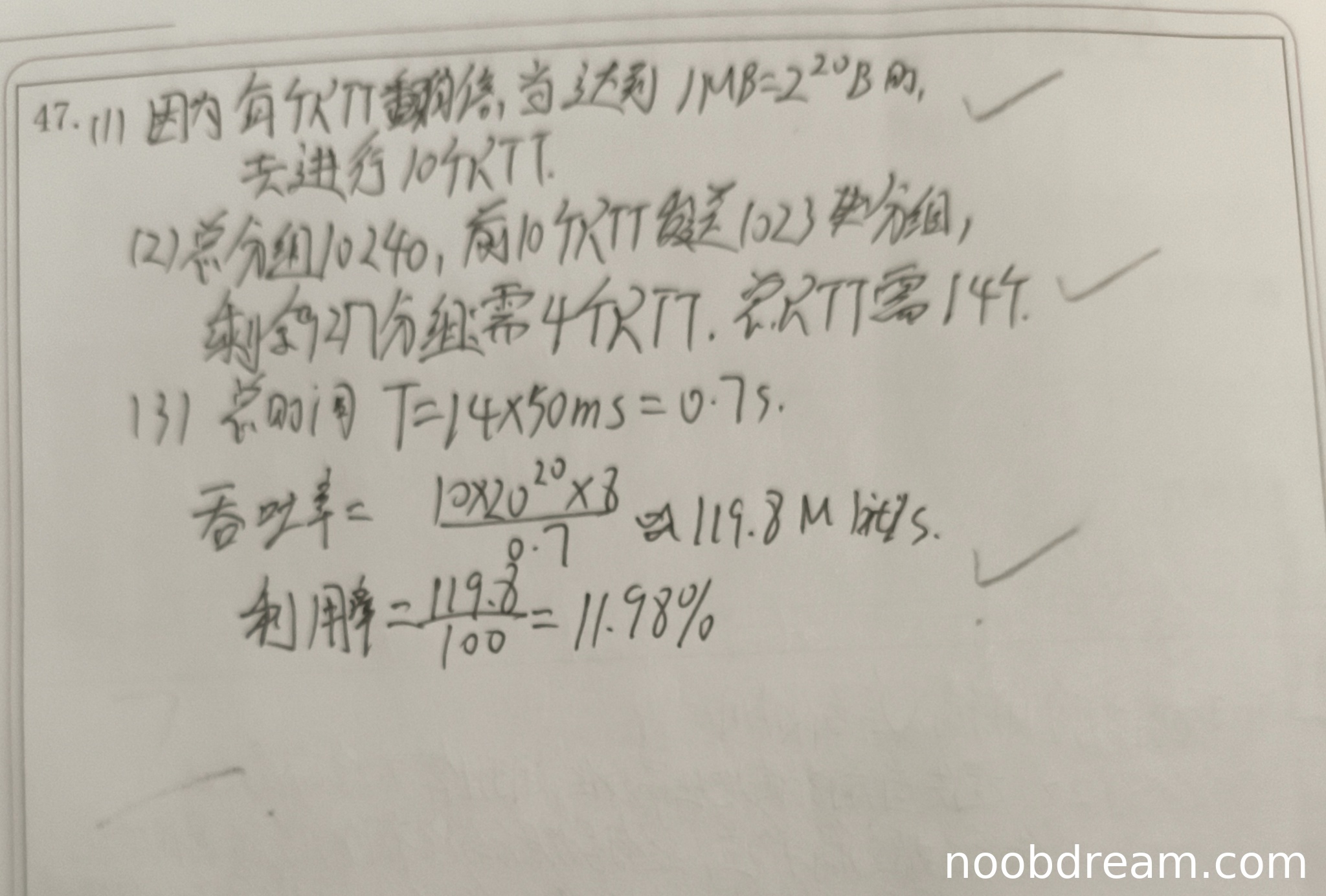 学生正确计算了总时间0.7s,吞吐率119.8Mbit/s,但利用率计算有误:应为119.8/1000=11.98%,学生写成了119.8/100=11.98%。虽然分母写错但结果正确,可能是识别误差。给2分。