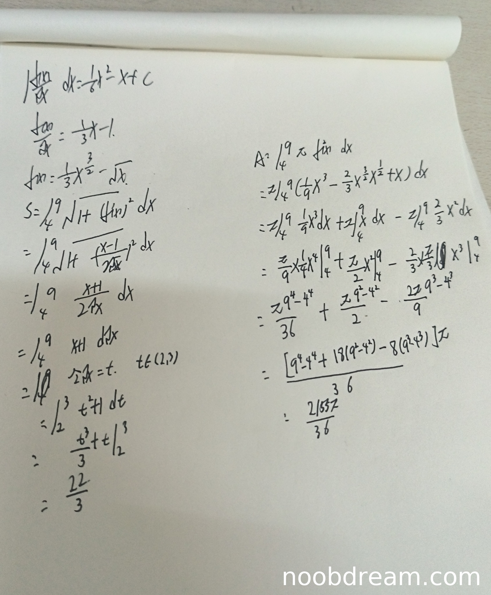 学生正确地从积分方程求导得到f(x) = (1/3)x^(3/2) - √x,并正确计算了f'(x) = (1/2)(√x - 1/√x)。在计算弧长时,正确写出弧长公式S = ∫√[1+(f'(x))²]dx,并正确化简得到被积函数为(x+1)/(2√x)。通过代换√x=t正确计算积分,得到S=22/3。整个过程思路清晰,计算正确。得6分。