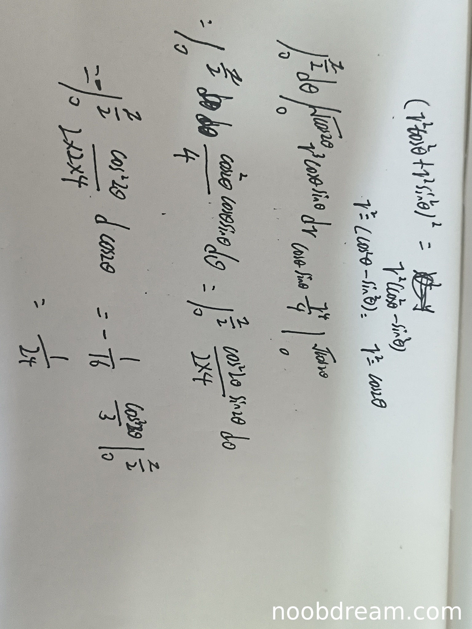 学生作答内容与题目要求完全不符。题目要求计算二重积分∬D x y dxdy,其中区域D由曲线(x²+y²)²=x²-y²(x≥0,y≥0)与x轴围成。但学生作答讨论的是完全不同的积分∫0π/4(tanθ+cotθ)²dθ的计算,这属于严重的逻辑错误。