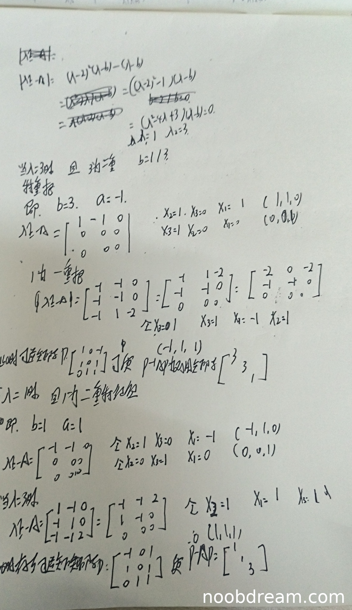 当b=1时,得出a=1,并求出了对应的特征向量(-1,1,0)ᵀ和(0,0,1)ᵀ(对应λ=1),以及(1,1,1)ᵀ(对应λ=3)。