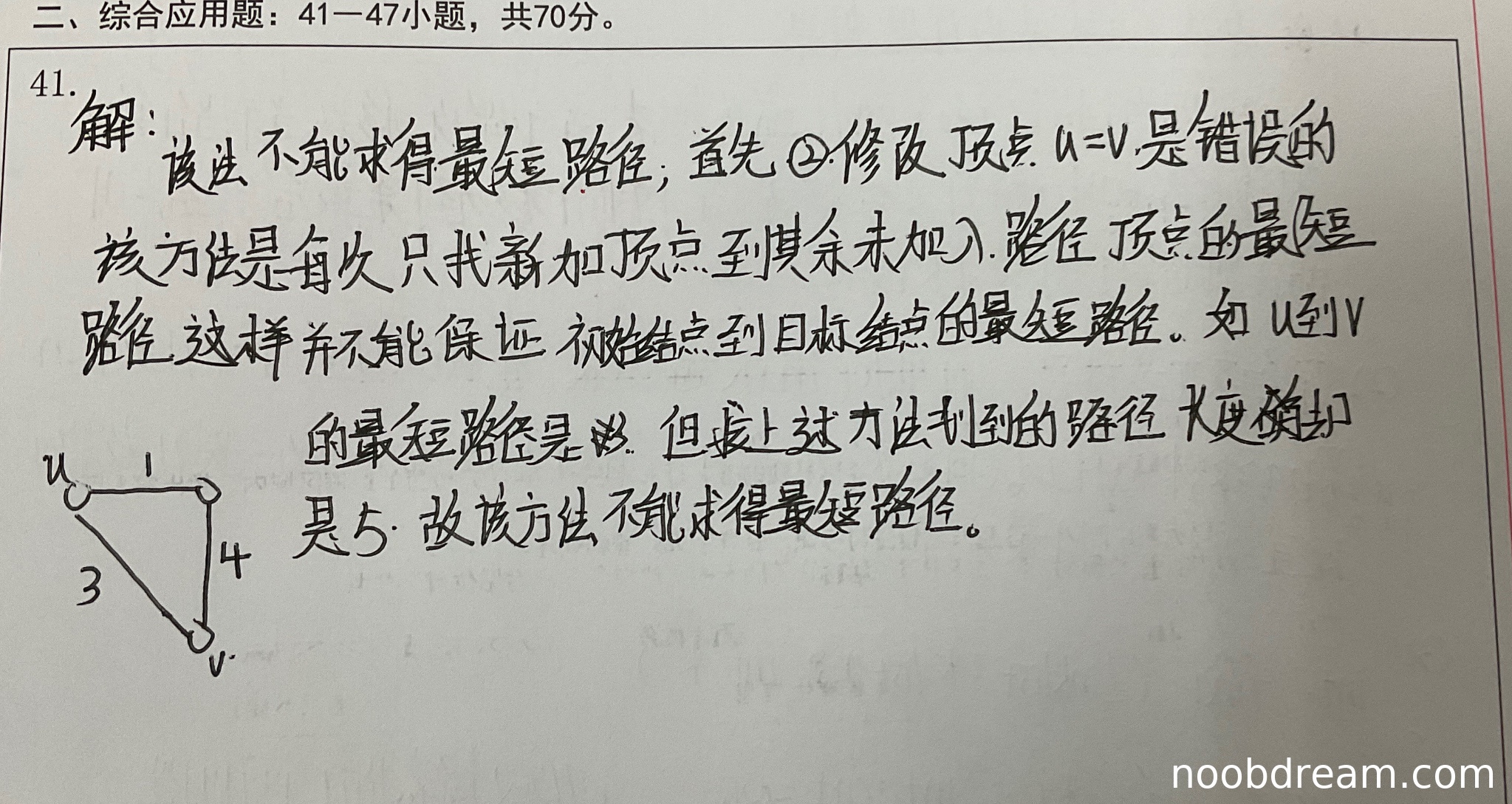 学生回答指出该方法不能求得最短路径,这与标准答案一致,核心判断正确。学生给出的理由"每次只找新加顶点到其余未加入路径顶点的最短路径,这样并不能保证初始结点到目标结点的最短路径"准确指出了该方法的缺陷,即这是一种贪心策略,不能保证全局最优。虽然学生没有像标准答案那样给出具体图例,但解释合理且正确。根据评分标准,思路正确不扣分,因此得10分。