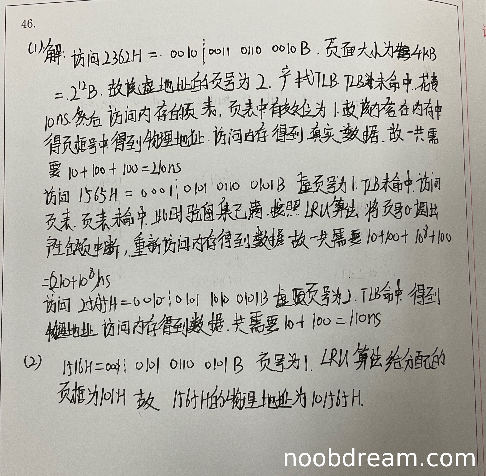 学生对于2362H和25A5H(学生写作2545H,但根据上下文判断应为25A5H的误写)的时间计算正确,分别得到210ns和110ns,计算过程合理。但对于1565H的时间计算存在严重错误:学生误认为页表命中,实际上页表有效位为0表示页面不在内存,应产生缺页中断,且缺页处理时间为10^8 ns,但学生错误地使用了10^3 ns(即1000ns),导致计算结果1210ns与标准答案100,000,220ns相差巨大。这是核心逻辑错误,扣分严重。考虑到前两个地址计算正确,但第三个地址计算有重大错误,本小题扣3分,得3分。