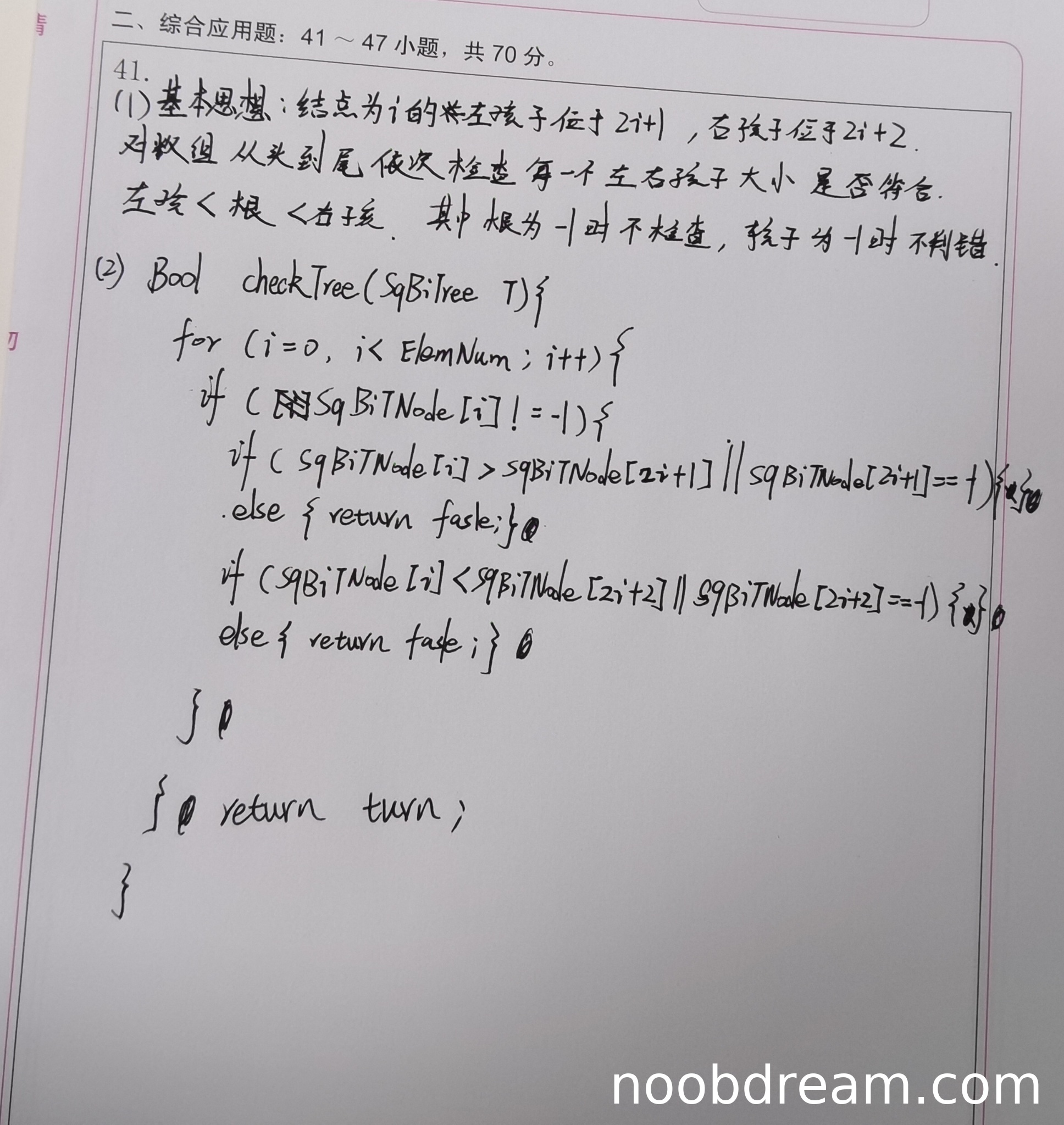 理由:学生的基本设计思想存在明显缺陷。虽然正确指出了二叉树的顺序存储特性(左孩子在2i+1,右孩子在2i+2),但提出的检查方法"对数组从头到尾依次检查每一个左右孩子大小"是不正确的。这种方法只能检查直接父子关系,无法验证整个子树的范围约束,而二叉搜索树要求左子树所有节点都小于根节点,右子树所有节点都大于根节点。学生的思路无法处理跨层级的约束关系。