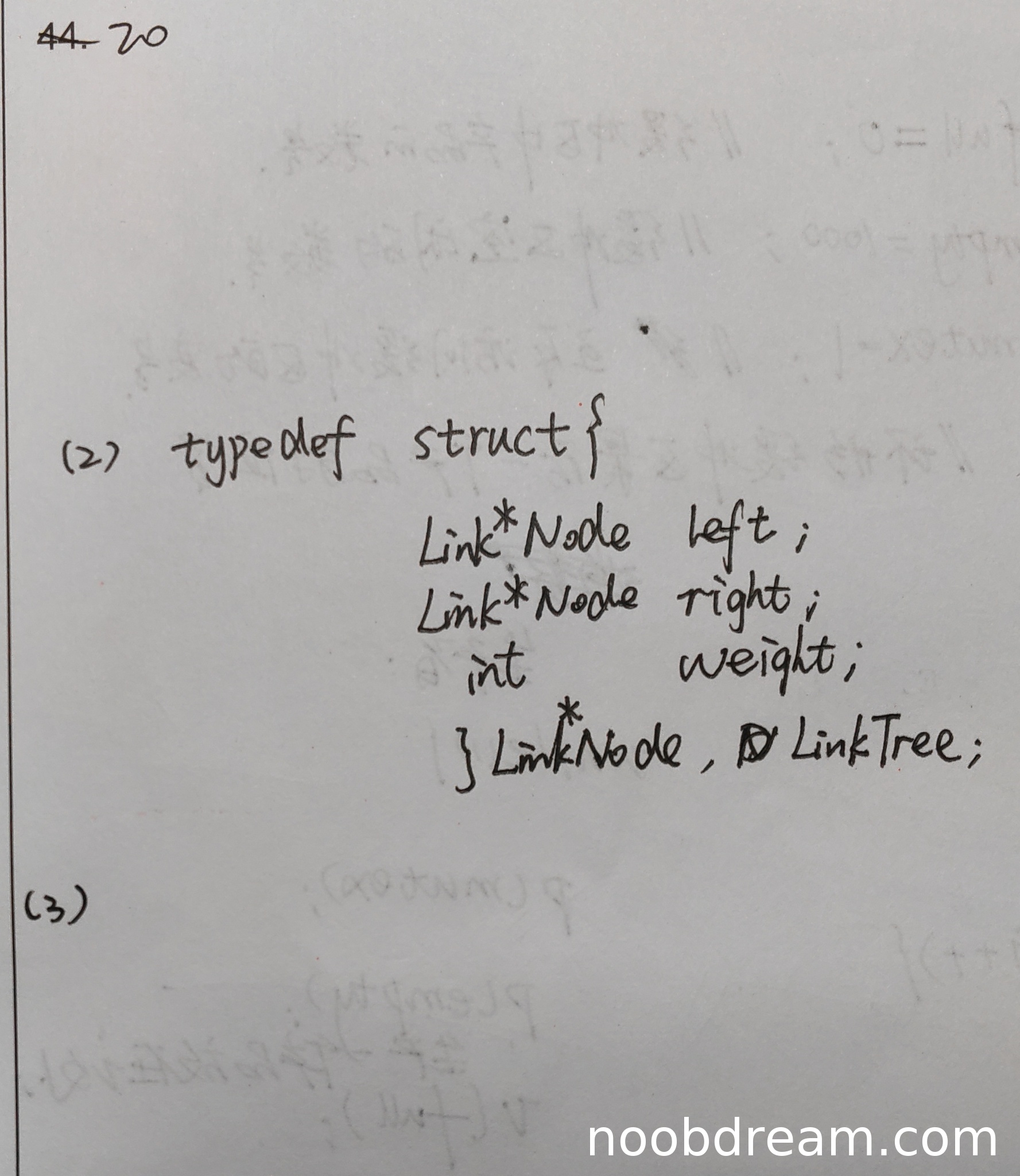 理由:学生给出了二叉树结点的数据类型定义,基本结构正确,包含了left、right指针和weight权值域。但存在以下问题: