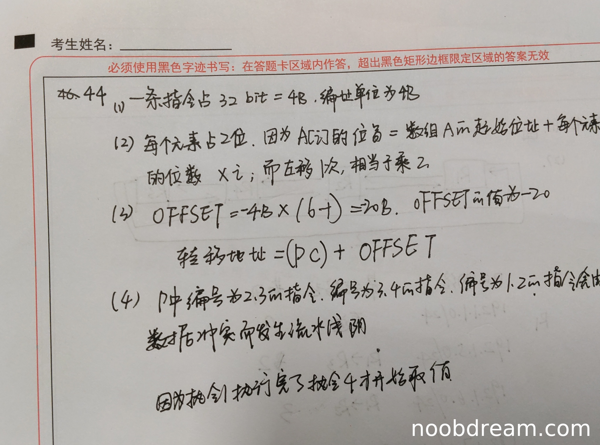 学生答案:OFFSET=-4B×(6 - 1)= -20B,OFFSET的值为-20。转移地址=(PC)+OFFSET。