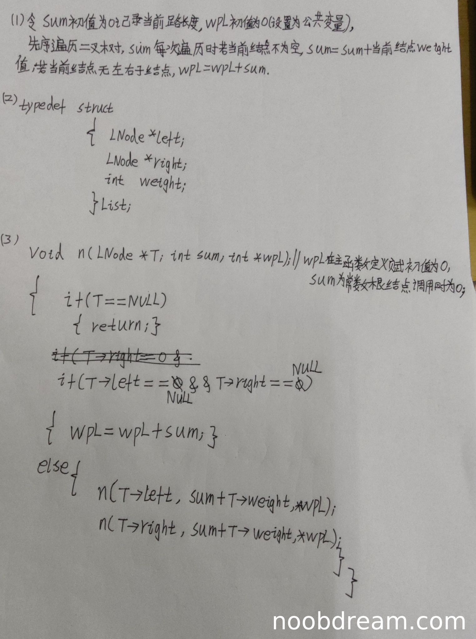 理由:学生的基本设计思想存在逻辑错误。题目要求计算的是"带权路径长度",即每个叶子结点的权值乘以该叶子结点的深度(从根结点到该叶子结点的路径长度)。学生的思路中,sum是累加路径上所有结点的权值,而不是记录深度,这会导致计算结果错误。例如,对于深度为d的叶子结点,正确的WPL贡献应该是weight×d,但按照学生的思路,贡献的是路径上所有结点权值之和,这与题目要求不符。