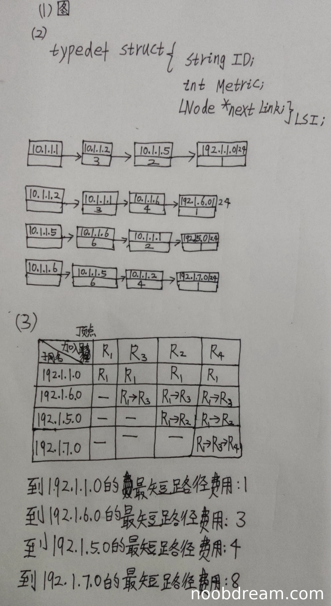 但学生正确计算了到192.1.1.0和192.1.7.0的路径费用,且基本理解Dijkstra算法思想。根据错误程度扣2分。得分:2分