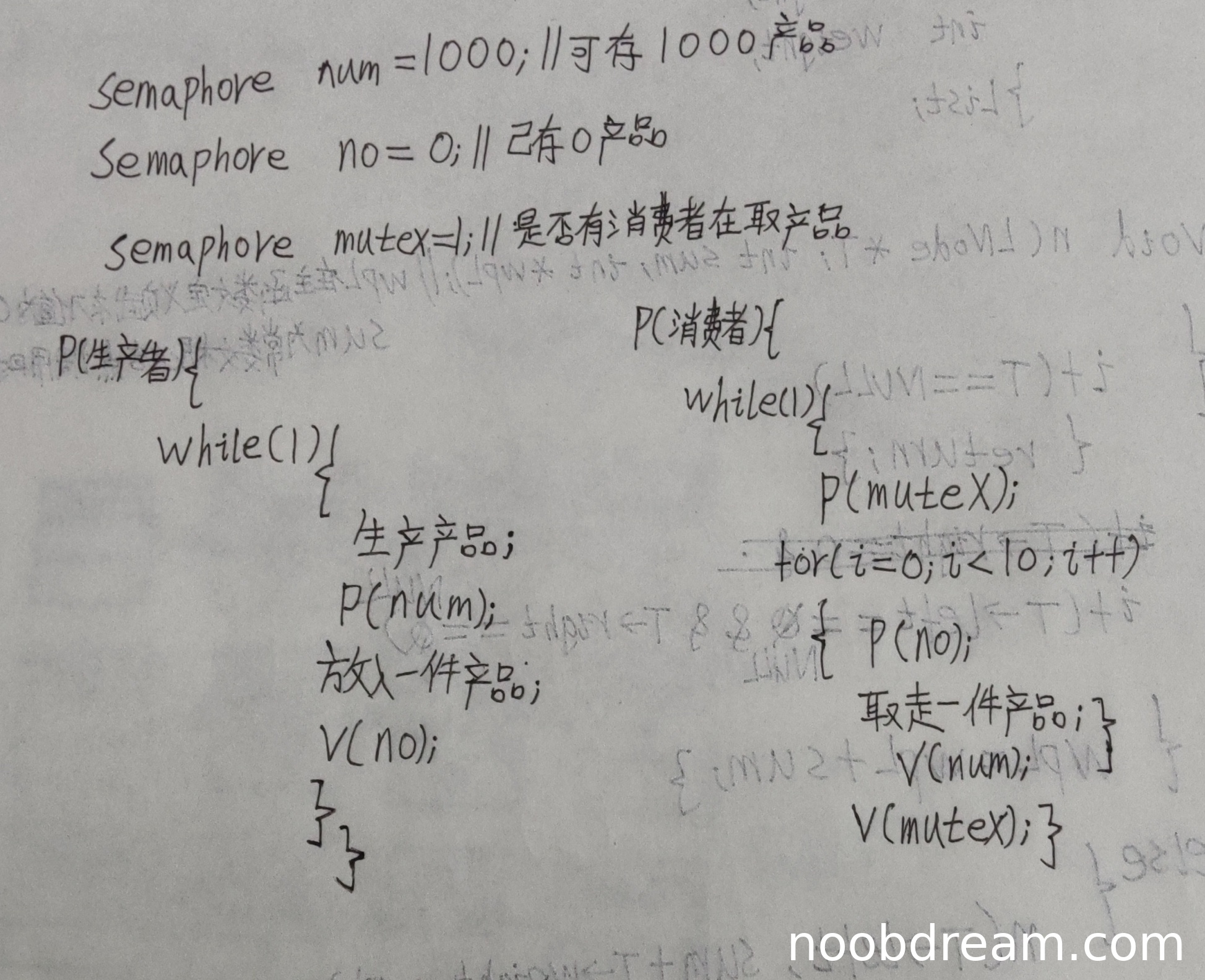 理由:通过P(num)/V(no)和P(no)/V(num)实现了基本的同步,但消费者端缺少对连续取10件的控制,且互斥信号量使用不完整,扣1分。