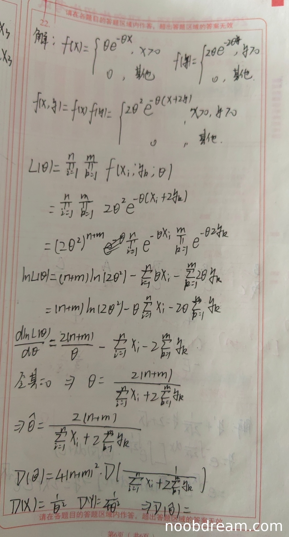 由于第(1)部分的最大似然估计量推导错误,得到的估计量\(\hat{\theta}\)不正确,因此基于错误估计量计算方差的尝试也无意义。学生写出了\(D(\hat{\theta})\)的表达式,但未完成计算,且基于错误估计量。因此,本部分得0分。