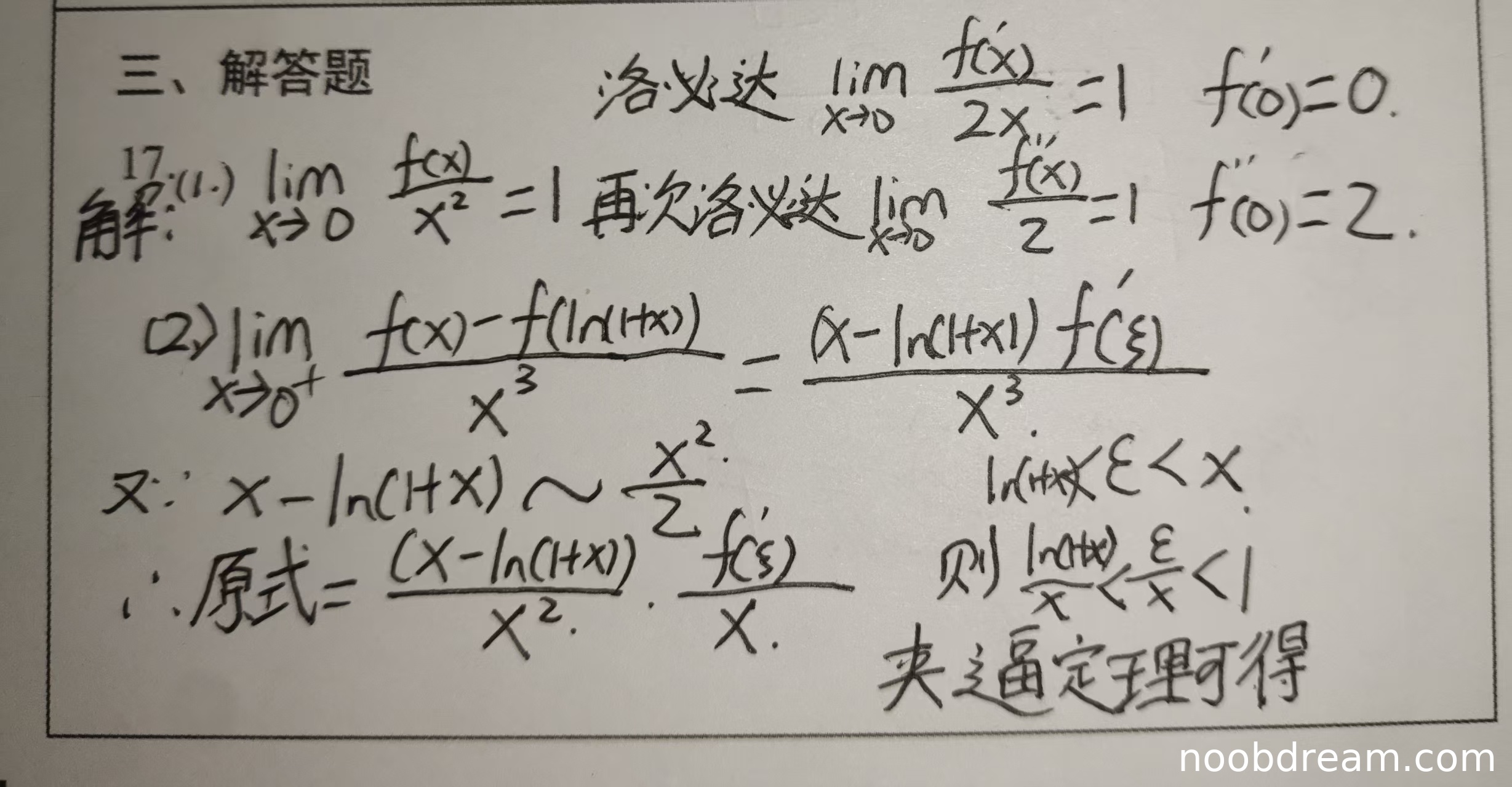 - 学生正确使用等价无穷小 \(x - \ln(1+x) \sim \frac{x^2}{2}\)。
