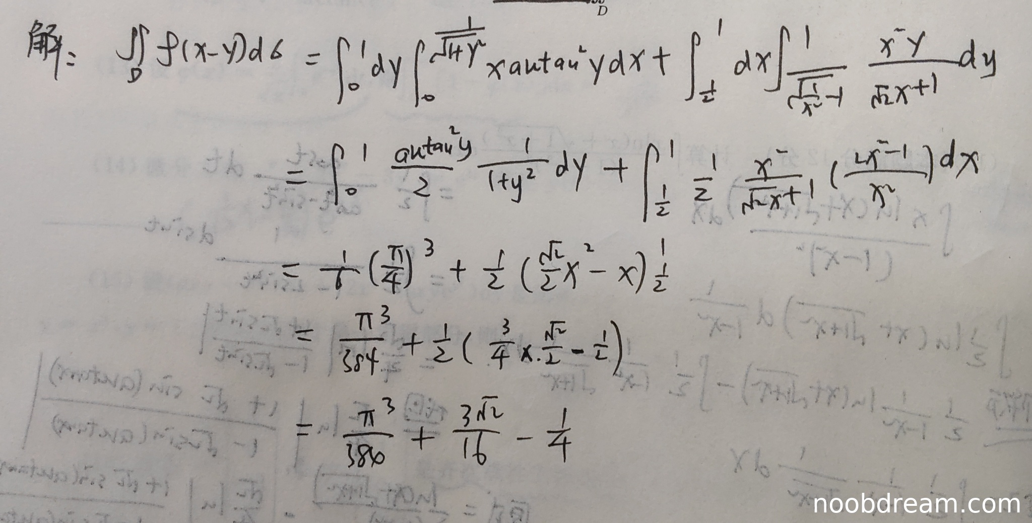 - 被积函数错误:在 \(D_1\) 区域,学生将 \(f(x,y) = x\arctan^2 y\) 误写为 \(x\arctan y\),扣2分;在 \(D_2\) 区域,将 \(f(x,y) = \frac{x^2 y}{\sqrt{2}x + 1}\) 误写为 \(\frac{x-y}{\sqrt{2x+1}}\),扣2分。