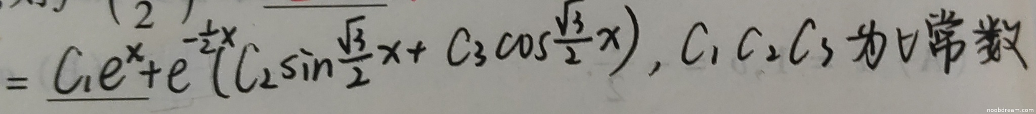 学生给出的答案为 \(y=C_{1}e^{x}+e^{-\frac {1}{2}x}(C_{2}\sin\frac {\sqrt {3}}{2}x + C_{3}\cos\frac {\sqrt {3}}{2}x)\),其中 \(C_{1}, C_{2}, C_{3}\) 为常数。该答案对应于微分方程的特征方程 \(r^3 - 1 = 0\) 的根 \(r = 1\) 和 \(r = -\frac{1}{2} \pm \frac{\sqrt{3}}{2}i\),因此是微分方程的一个正确通解形式。