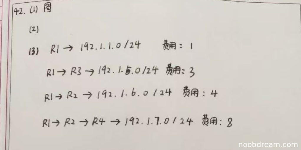 学生答案: - R1→192.1.1.0/24 费用:1 ✓ - R1→R3→192.1.5.0/24 费用:3 ✓ - R1→R2→192.1.6.0/24 费用:4 ✓ - R1→R2→R4→192.1.7.0/24 费用:8 ✓ 所有最短路径及费用计算完全正确,与标准答案一致。得4分。