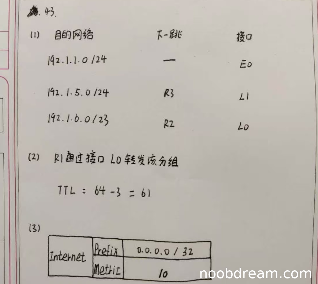 学生正确指出通过L0接口转发(1分),并计算TTL=64-3=61(1分)。计算过程和结果都正确,给2分。