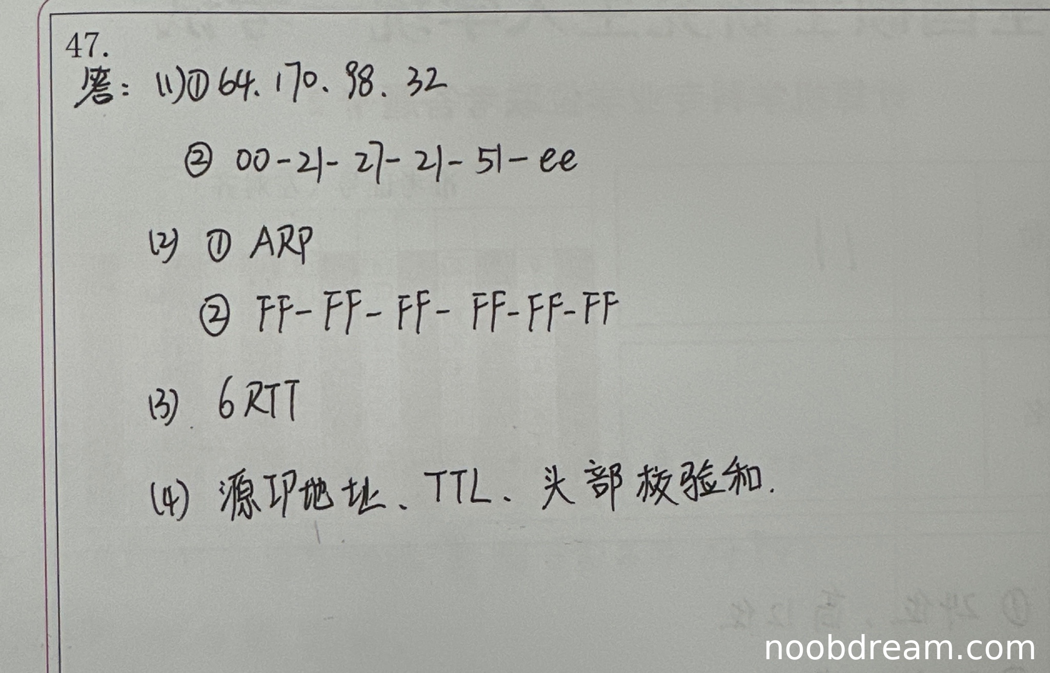 学生答案中,第一问使用的协议为ARP,正确;第二问目的MAC地址为FF-FF-FF-FF-FF-FF,即广播地址,与标准答案一致。两问均回答正确,因此得2分。