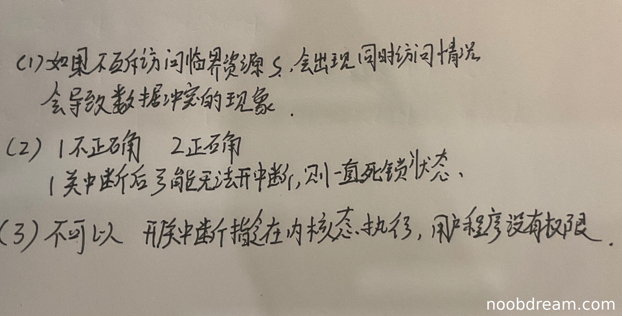 学生对方法1和方法2的判断正确(方法1不正确,方法2正确),得1分。对方法1的解释"关中断后可能无法开中断,则一直死锁状态"虽然表述不够准确(应该是while循环无法跳出而非无法开中断),但基本指出了问题的本质。对方法2没有给出解释,扣1分。本小题得2分。