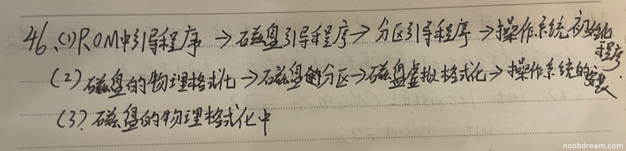 标准答案:磁盘的物理格式化、对磁盘进行分区、逻辑格式化、操作系统的安装