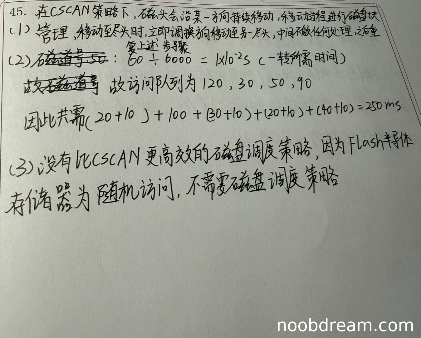 学生回答存在多处错误:首先,CSCAN调度顺序应为120、30、50、90,但学生未正确计算移动距离;其次,计算中使用了错误的时间单位(如60÷6000=0.01s)和未定义的参数(如"10");最后,未考虑旋转延迟和读取扇区时间。虽然调度顺序正确,但计算过程和结果错误,因此得1分(部分正确)。
