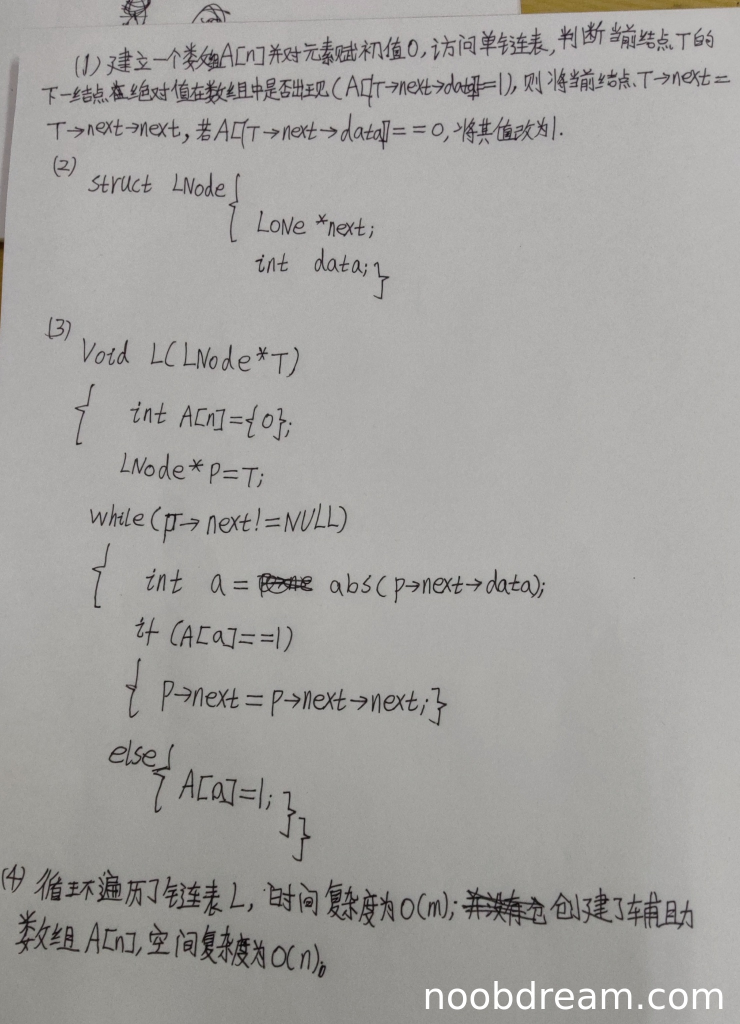 理由:学生的基本设计思想与标准答案一致,都是使用辅助数组记录已出现的绝对值,通过一趟扫描链表实现删除重复绝对值结点的功能。思路正确完整,没有逻辑错误。