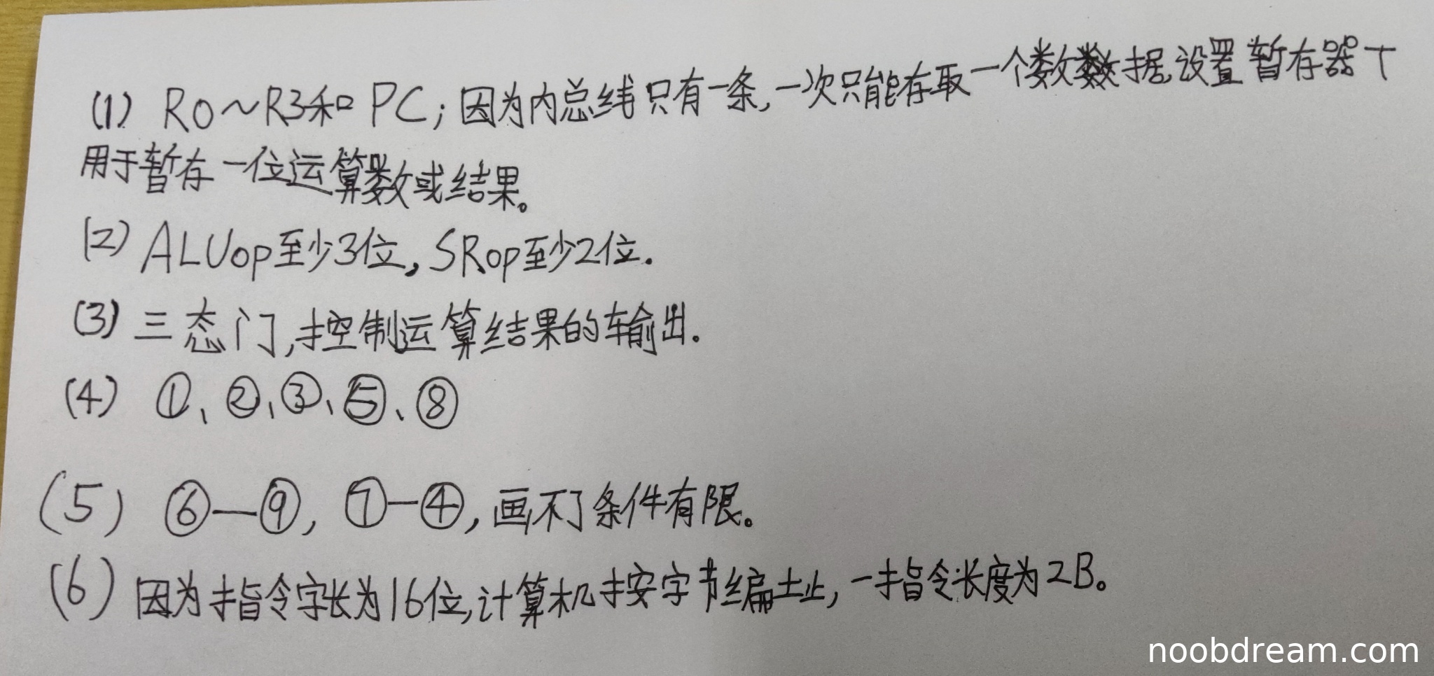 学生正确回答ALUop至少3位(7种操作需要3位控制信号),SRop至少2位(3种操作需要2位控制信号),与标准答案完全一致。得2分。