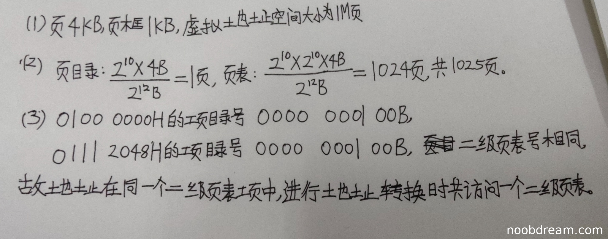学生正确分析了两虚拟地址的页目录号相同(均为0000 0001 00B,即4),得出只需访问一个二级页表的结论,与标准答案一致。得2分。