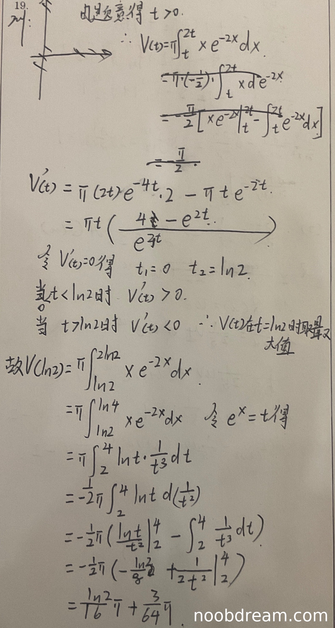 学生对 \(V(t)\) 求导时,虽然过程与标准答案不同,但最终得到的导数表达式 \(V'(t)=\pi t(\frac{4-e^{2t}}{e^{3t}})\) 等价于标准答案中的 \(\pi te^{-2t}(4e^{-2t}-1)\)(通过通分可验证)。求极值点时正确得到 \(t=\ln2\),并正确分析单调性。思路正确不扣分。得5分。