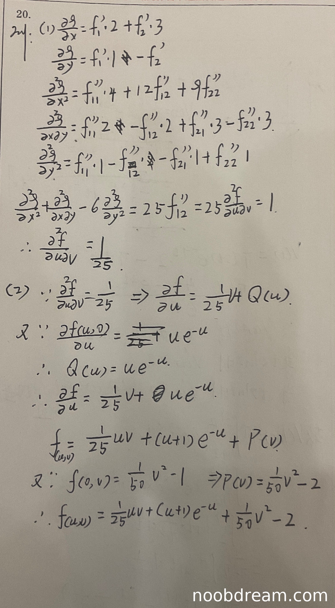学生正确计算了一阶偏导和二阶偏导,并代入方程得到 \(25f_{12}'' = 1\),从而得出 \(\frac{\partial^2 f}{\partial u\partial v} = \frac{1}{25}\)。虽然二阶混合偏导 \(\frac{\partial^2 g}{\partial x\partial y}\) 和 \(\frac{\partial^2 g}{\partial y^2}\) 的表达式中有符号错误(如 \(\frac{\partial^2 g}{\partial x\partial y}\) 中应为 \(+ f_{12}''\) 而不是 \(- f_{12}''\cdot2\),且 \(f_{21}''\) 与 \(f_{12}''\) 合并时未正确处理),但最终代入方程后错误项相互抵消,得到了正确结果。考虑到核心思路正确且最终答案正确,仅扣1分。得5分。