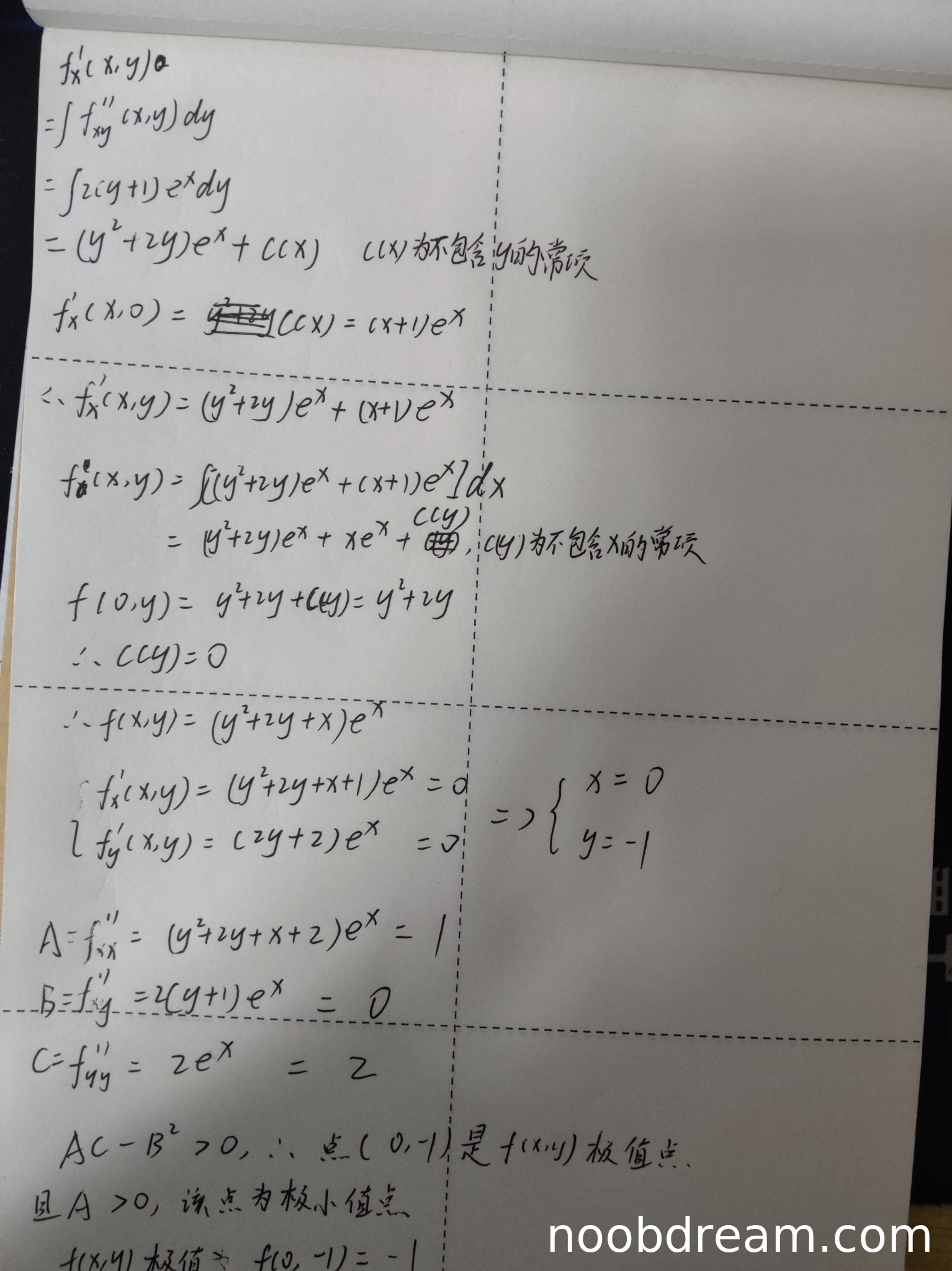 学生正确求出了一阶偏导数并令其为零找到驻点 \((0,-1)\),计算了二阶偏导数,并利用AC-B²判别法判断出该点为极小值点,计算了极小值。虽然由于函数表达式错误导致具体数值计算基于错误函数,但极值分析的方法和步骤完全正确,因此不扣分。
