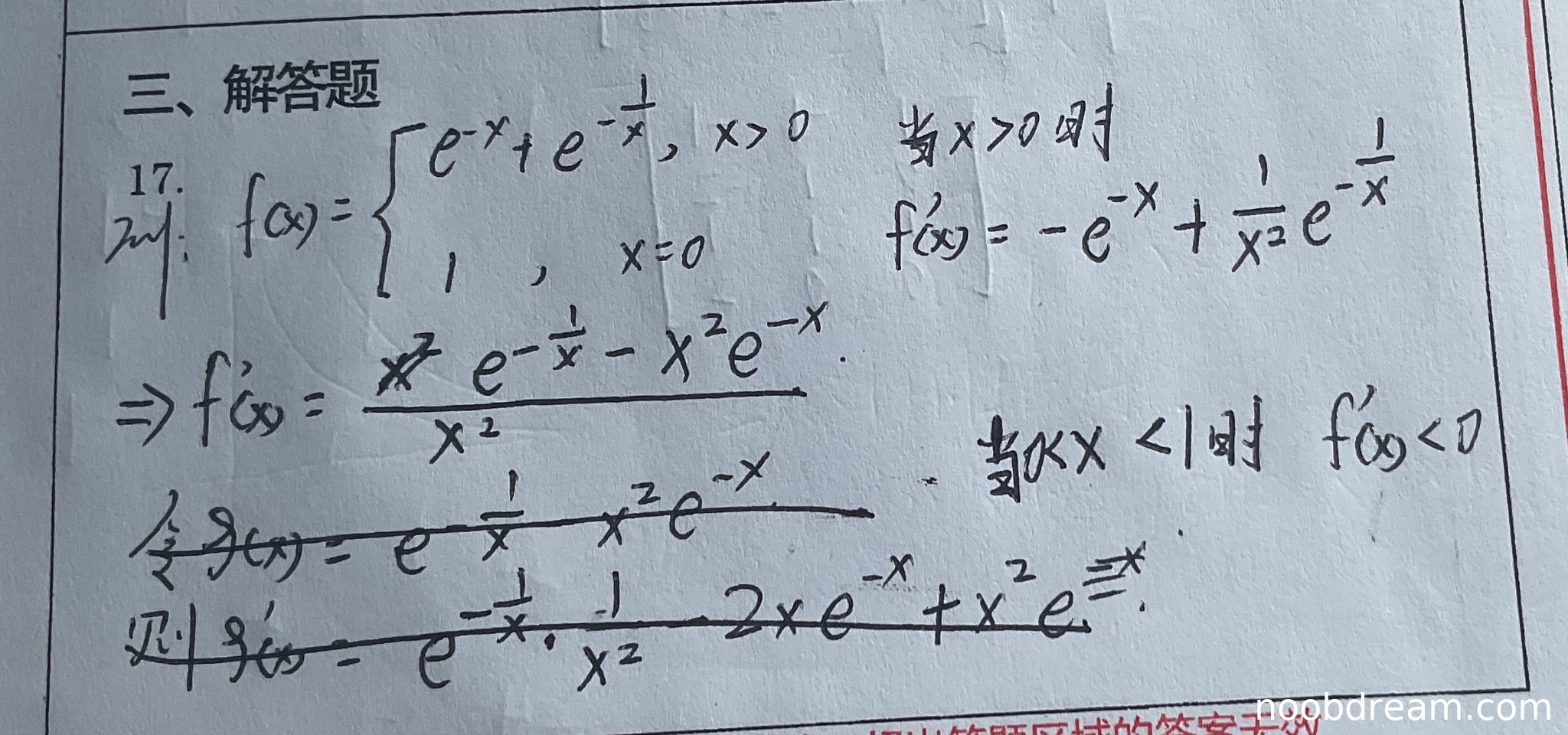 第一次识别结果未给出导数计算过程,第二次识别结果给出了正确的导数表达式f'(x)=-e^{-x}+\frac{1}{x^2}e^{-\frac{1}{x}},计算正确,得2分。