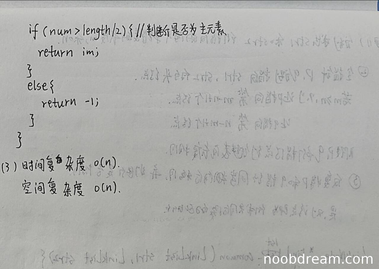 理由:学生的算法设计思想清晰,通过构建计数数组统计每个元素的出现次数,然后找出出现次数最多的元素并判断是否超过n/2。这种方法虽然与标准答案的摩尔投票法不同,但思路正确且能解决问题,因此不扣分。
