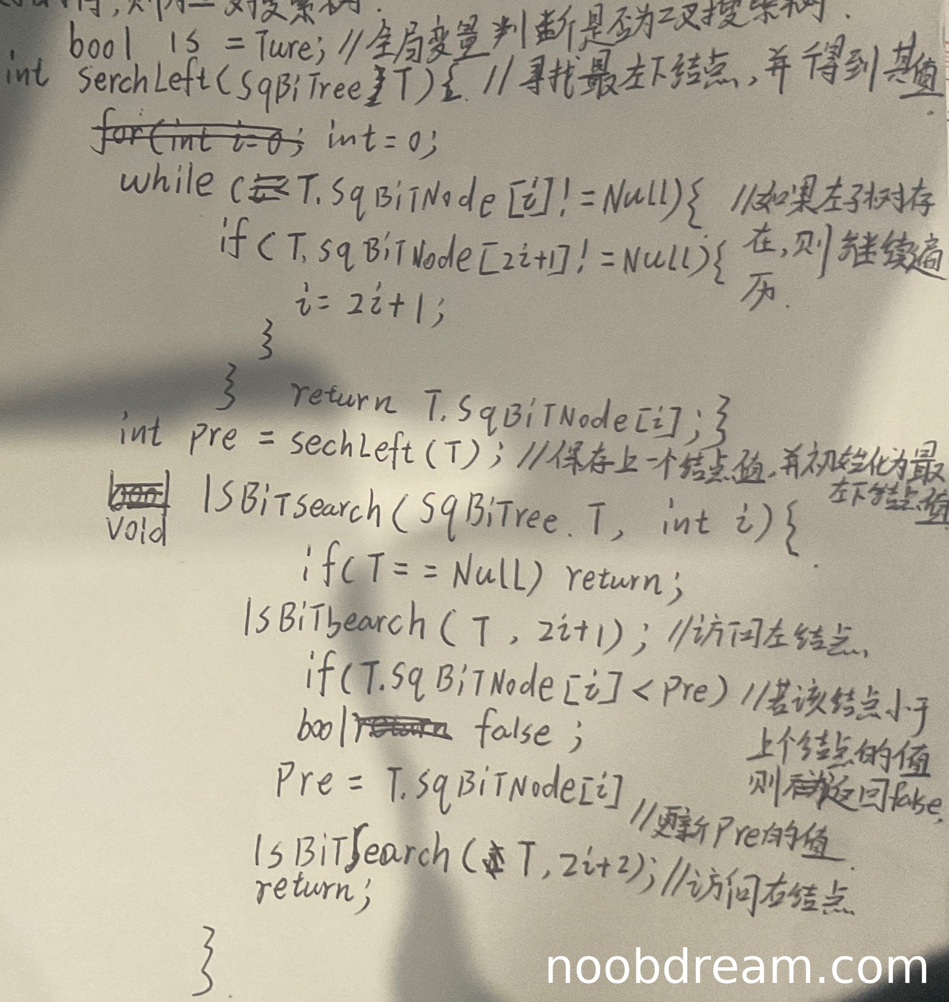 4. seachLeft函数逻辑错误(死循环风险,且返回值可能不是中序首结点)