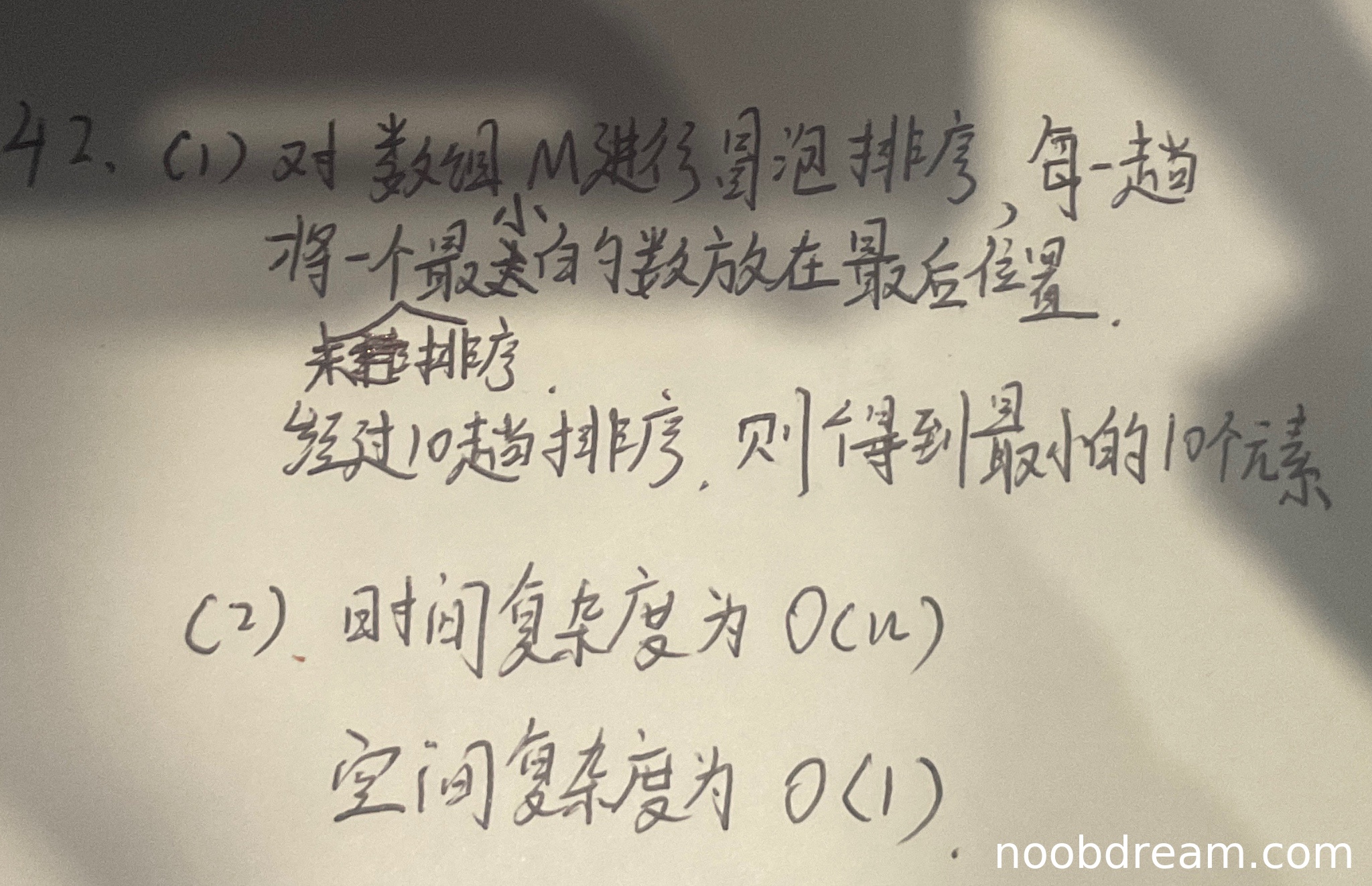 理由:学生正确给出了时间复杂度O(n)和空间复杂度O(1)。时间复杂度分析基本正确,因为10趟冒泡排序确实是O(10n)=O(n)。空间复杂度O(1)也正确,因为冒泡排序是原地排序。但由于算法思想不是最优,扣2分。