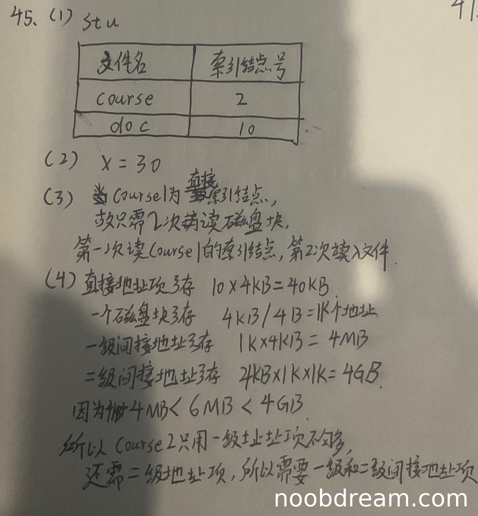 学生答案正确列出了目录文件stu的两个目录项:course索引节点号2、doc索引节点号10,与标准答案一致。得2分。