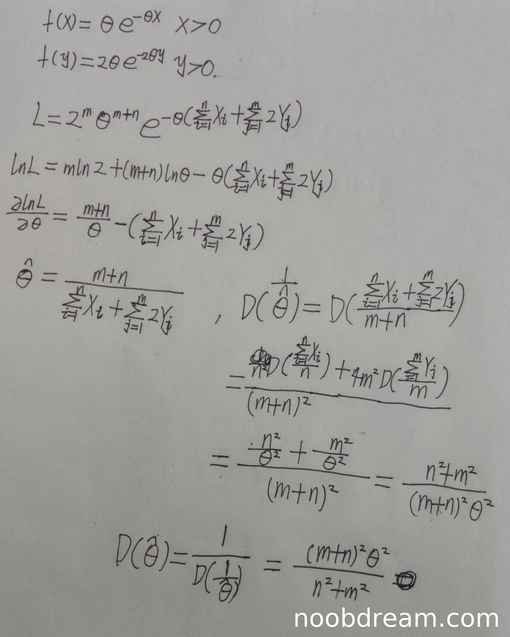 学生给出的概率密度函数形式与标准答案不一致:标准答案中X的密度为(1/θ)e^(-x/θ),学生写为θe^(-θx);Y的密度为(1/(2θ))e^(-y/(2θ)),学生写为2θe^(-2θy)。这导致后续似然函数构建错误。虽然学生按照最大似然估计的步骤进行了推导,但由于密度函数形式错误,导致最终的估计量形式错误。考虑到学生完整展示了最大似然估计的求解过程,给2分。