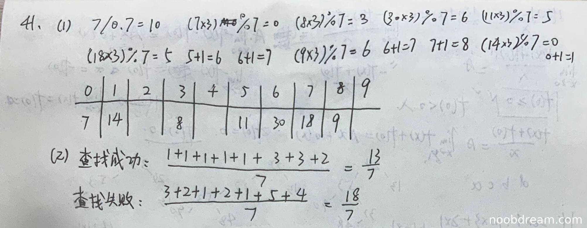 查找成功ASL计算:学生计算为(1+1+1+1+1+3+3+2)/7=13/7,但标准答案为12/7。检查发现学生计算的关键字查找次数有误:关键字14实际查找次数为2(H(14)=0,位置0被7占用,探测到位置1找到),但学生可能误算为1;关键字9实际查找次数为3(H(9)=6,位置6被30占用,位置7被18占用,位置8找到),但学生计算为2。因此查找成功ASL计算错误,扣2分。
