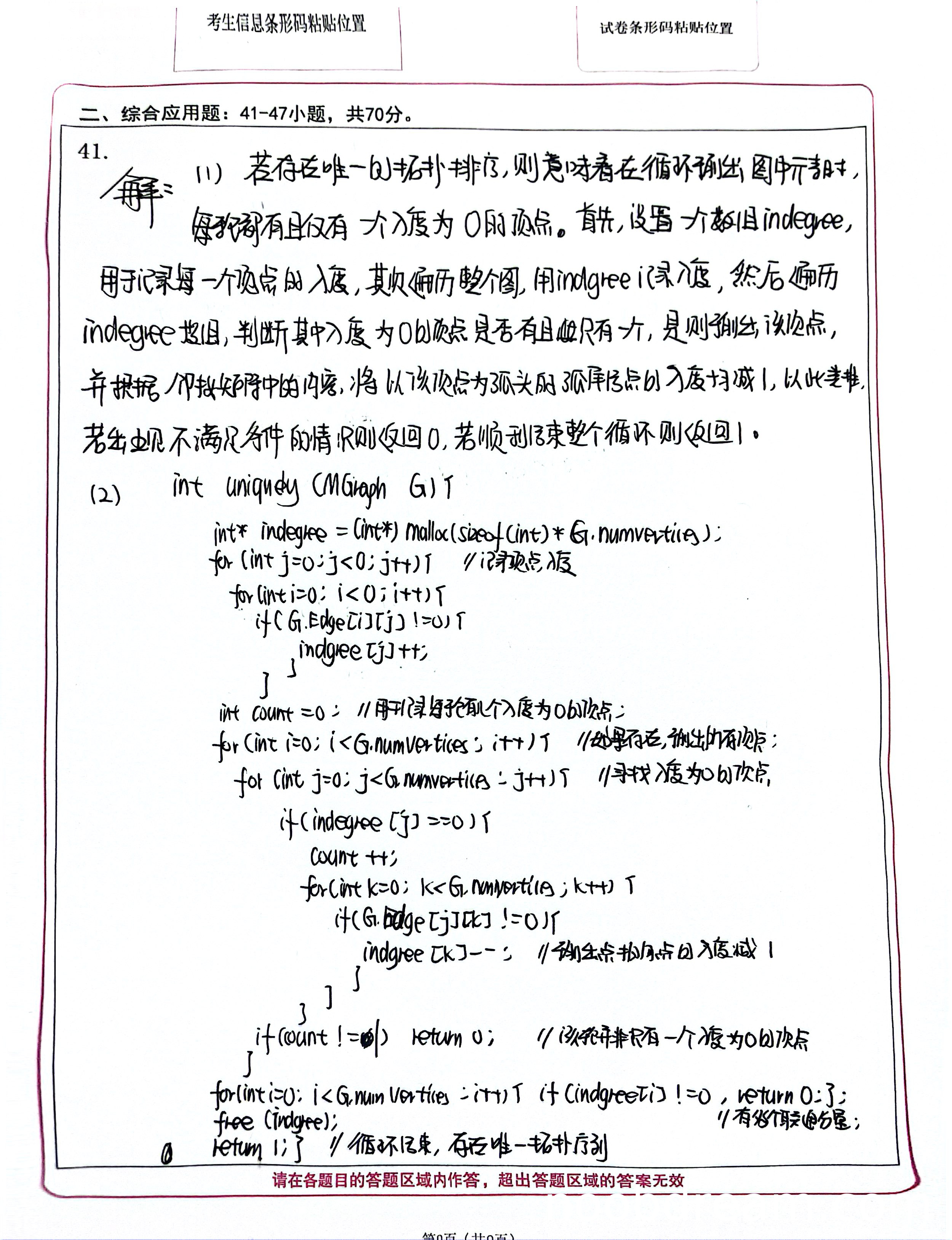 - 拓扑排序逻辑错误:内层循环中一旦找到入度为0的顶点就立即更新其邻接顶点的入度,这会导致在同一轮中可能处理多个入度为0的顶点,无法正确判断唯一性(核心逻辑错误,扣3分)